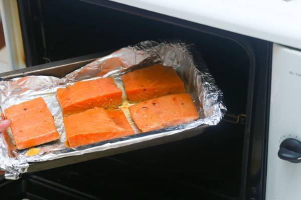 Cá hồi được ướp sẵn với công thức tùy thích rồi mới được cho vào lò nướng trong vòng 10 - 20 phút (tùy bạn thích ăn kỹ hay tái). (Ảnh: WH)