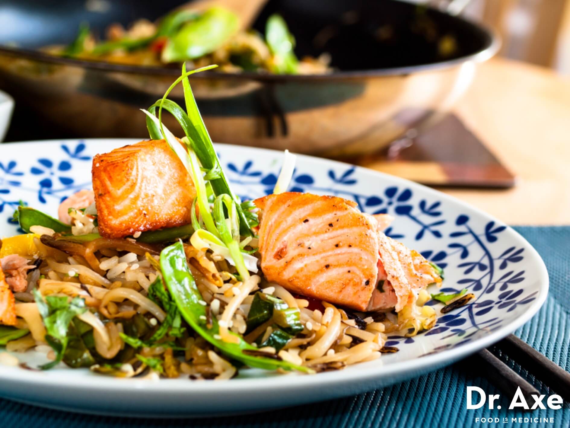 Cá hồi fillet xào lăn cùng rau củ được ăn kèm với cơm. (Ảnh: Dr Axe)