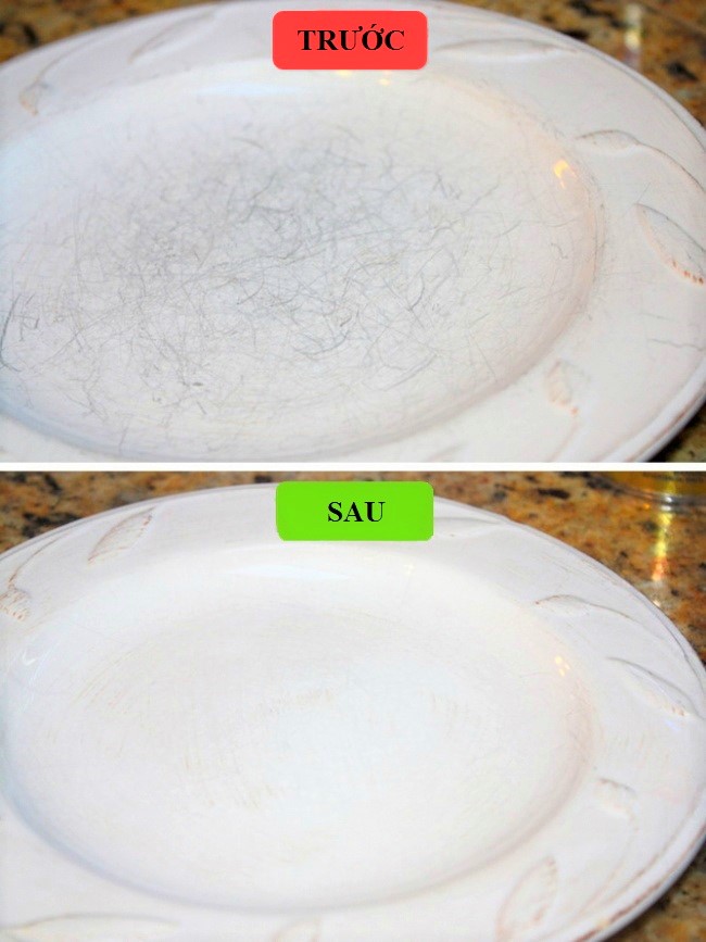 Hãy loại bỏ vết xước trên đĩa bằng cách chà muối nở (baking soda) lên bề mặt bị xước. Chiếc đĩa của bạn sẽ sáng bóng lên đáng kể, trông gần giống như mới chỉ được sử dụng một vài tháng.