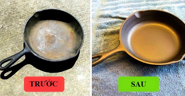 Ngâm chảo gang trong hỗn hợp gồm 1 phần dấm và 1 phần nước ấm 3 tiếng rồi chà sạch. Cho chảo vào lò ở nhiệt độ 250 độ C trong 1 tiếng thì lấy ra, bôi một lớp dầu ô liu hoặc dầu ăn khắp chảo và đặt úp chảo xuống cho vào lò thêm 15 phút nữa. Dùng khăn lau sạch và đặt chảo lại vào lò thêm 15 phút.