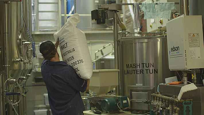 Công nhân đang khuân vác mạch nha vào xưởng bia thủ công Holgate Brewhouse, Australia.