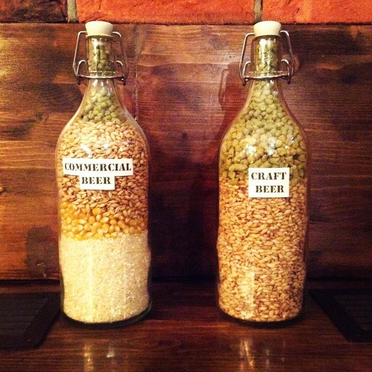 So sánh giữa nguyên liệu sản xuất bia thương mại (trái) và bia thủ công (phải). Bia thương mại dùng rất nhiều gạo và ngô nhằm tiết kiệm vốn nguyên liệu. Trong khi đó, bia thủ công sử dụng mạch nha nhiều hơn hẳn, hoàn toàn không sử dụng gạo và ngô. (Ảnh: Pinterest)
