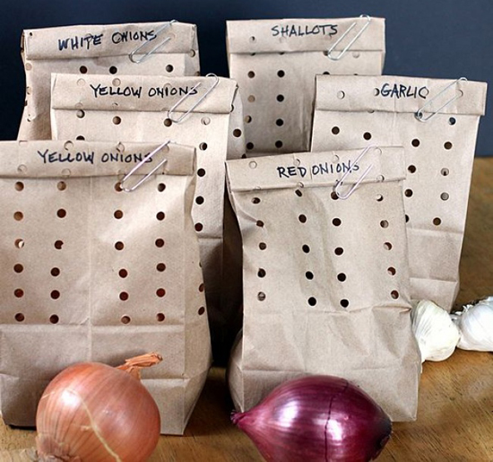 9. Hành và tỏi "yêu bóng tối": Người bạn tốt nhất của tỏi và hành tây là bóng tối. Bạn có thể đặt chúng trong túi giấy với nhiều lỗ nhỏ đã được đục để thoáng khí. Bằng cách đó bạn có thể lưu trữ chúng khá lâu, tiện mang đi mang lại mà vẫn đảm bảo đặc tính không ưa ánh sáng của chúng.