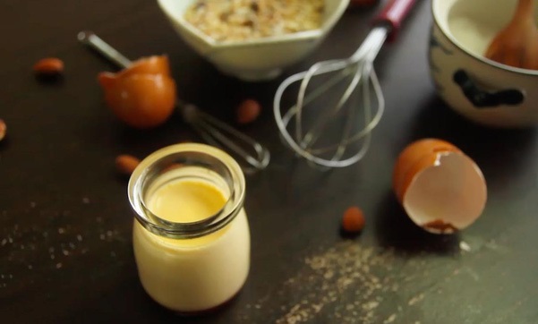 Bước 2: Khi lòng đỏ trứng đã tan, cho từng thìa sữa đặc vào rồi đánh đều.