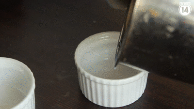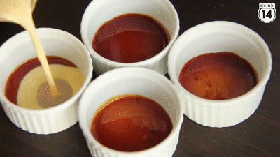 Bước 5: Đổ caramel vào các khay sứ rồi để trong ngăn mát tủ lạnh để caramel đông lại.