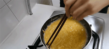 Bước 5: Sau khi dầu sôi, cho trứng vào và khuấy đều cho đến khi trứng vừa chín sệt lại.