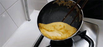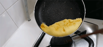 Sau đó, bạn hãy khéo léo hất nhẹ chảo để phần trứng nghiêng ra ngoài và dùng đũa gạt cho chúng kín lại.