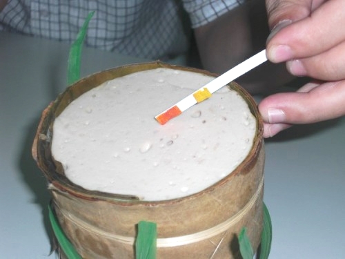 Thử độ hàn the trong giò bằng giấy nghệ. Màu đỏ trên giấy đã chỉ ra rằng khoanh giò có chứa loại hóa chất này. (Ảnh: Bestie)