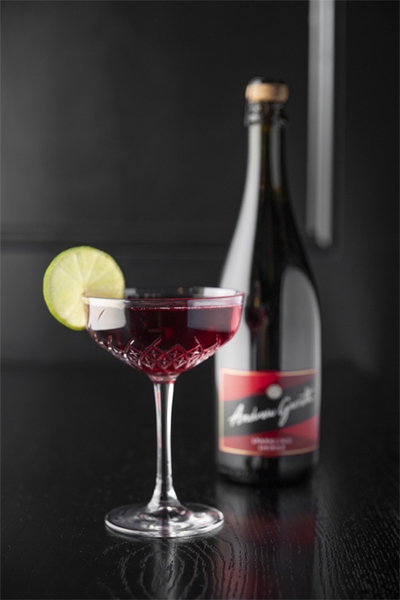 Đổ lần lượt rượu gin, nước chanh, sirô đường rồi cuối cùng là vang sủi đỏ Andrew Garrett. Trang trí với một lát chanh.