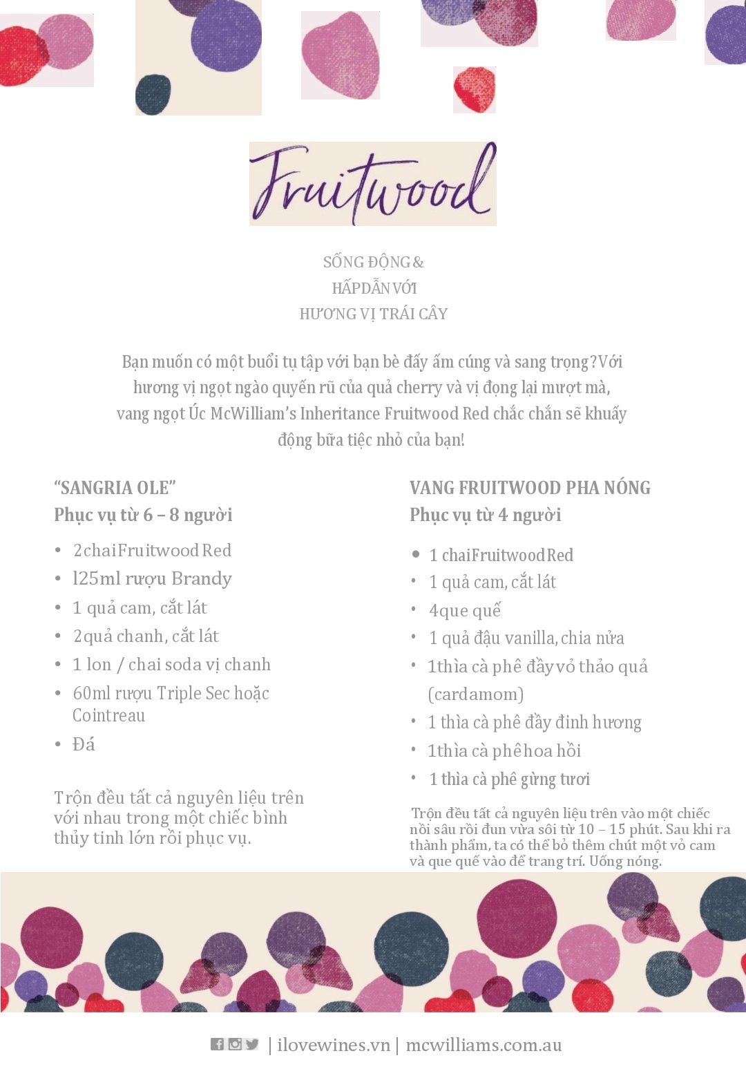 McWilliam's Inheritance Fruitwood Red là dòng rượu êm ái và tràn ngập hương anh đào, dâu tây và mâm xôi tươi mát. Rượu có thể uống nguyên chất, hoặc dùng để pha trộn làm cocktail.