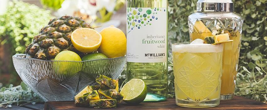 Bao bì cũ của Fruitwood White với một ly cocktail dứa được pha từ chai rượu này. (Ảnh: McWilliam's Wines)
