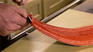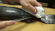 Sử dụng dao sắc, lưỡi dao không cứng quá (có thể uốn), bắt đầu cắt chéo từ phần đuôi xuống sát da cá. Nắm chặt phần da, di chuyển dao dọc lên theo thân cá, sát da trong khi vẫn kéo phần da về phía mình.