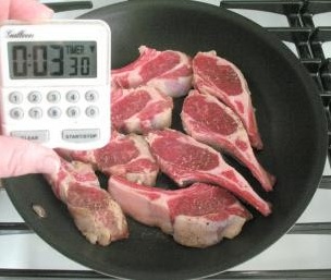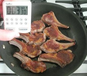 - Cho sườn cừu vào chảo rán. Bạn phải nghe thấy tiếng "xèo xèo" của thịt rán. Lúc đó, chảo mới đủ nóng.