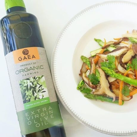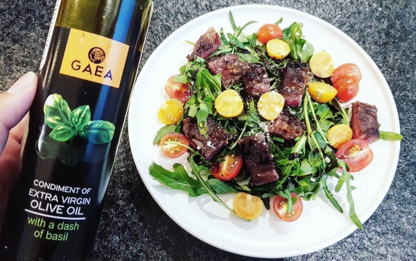 Dầu ô liu húng quế GAEA Hy Lạp và món salad được trộn cùng. (Ảnh: GAEA)