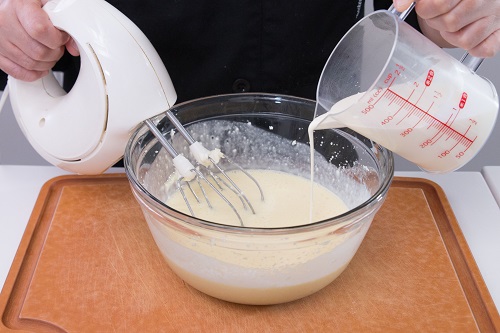 Bước 2: Rót từ từ kem tươi (Whipping Cream) vào và đánh tiếp cho đến khi kem bông xốp. Nước cốt chanh sẽ giúp hỗn hợp có kết cấu ổn định hơn.