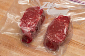 Bước 1: Đặt thịt vào túi, bóp cho không khí ra hết khỏi túi rồi đóng mép túi lại. Hoặc, bạn có thể tham khảo cách hút chân không thực phẩm chỉ với một bát nước TẠI ĐÂY.